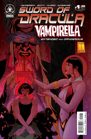 Digital Webbing Press has just released Sword of Dracula/Vampirella: Extended and Dangerous. This 32-page, full color comic tells the story of what happens “When Dracula, the world’s most dangerous terrorist, loses a key vampire witness to Ronnie Van Helsing of the Polidorium, it’s an all-out war of vampires, guns, trucks, and RPGs to get the witness back. And into the middle rides Vampirella, who is picking a side all her own. But will Vampirella and Ronnie’s mysterious past tilt the balance in Dracula’s favor?”