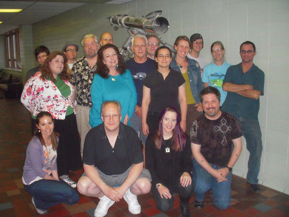 Off the top of my head, I want to thank Workshop founder and leader Mike Brotherton, his partner in crime Jim Verley, and guest instructor Kevin R. Grazier, for dumping as much information on us as possible, but doing so in a palatable, fascinating way. I also want to thank NASA for funding it. And it wouldn’t have been nearly as interesting without the participation of my fellow students: John Joseph Adams, Kelly Barnhill, Monte Cook, Alice Henderson, Marjorie M. Liu, Bud Sparhawk, Rachel Swirsky, Cecilia Tan, Genevieve Valentine, Carrie Vaughn, Nick Wethington, David J. Williams, and Walter Jon Williams. There were also guest appearances by Travis Laurence, Sabrina Cales, Rebecca Stoll, Stephanie Slater, Jeremy Tolbert, Christine Stebbins, and Jessie Runnoe, all of whom contributed greatly to the learning and enjoyment. (The class photo, taken on the first day, is by Kevin Grazier.)